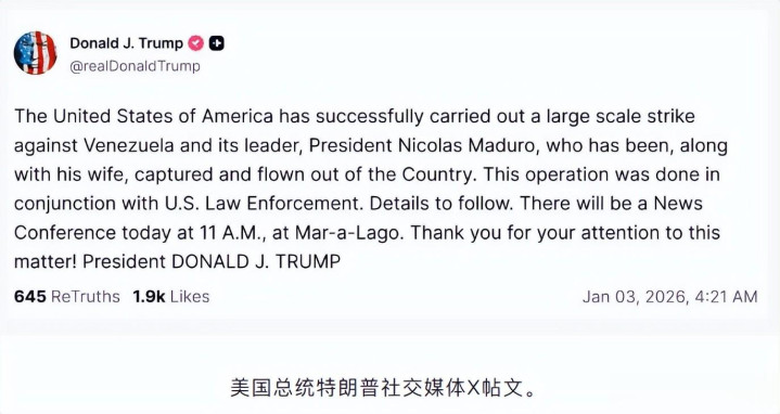 在对委内瑞拉进行了一段时间的海上封锁之后,1月3号美国对委内瑞拉实施了军事打击,美国东部时间凌晨4:21左右,美国总统特朗普在社交媒体上公开发文,称已经抓捕了马杜罗和他的夫人。