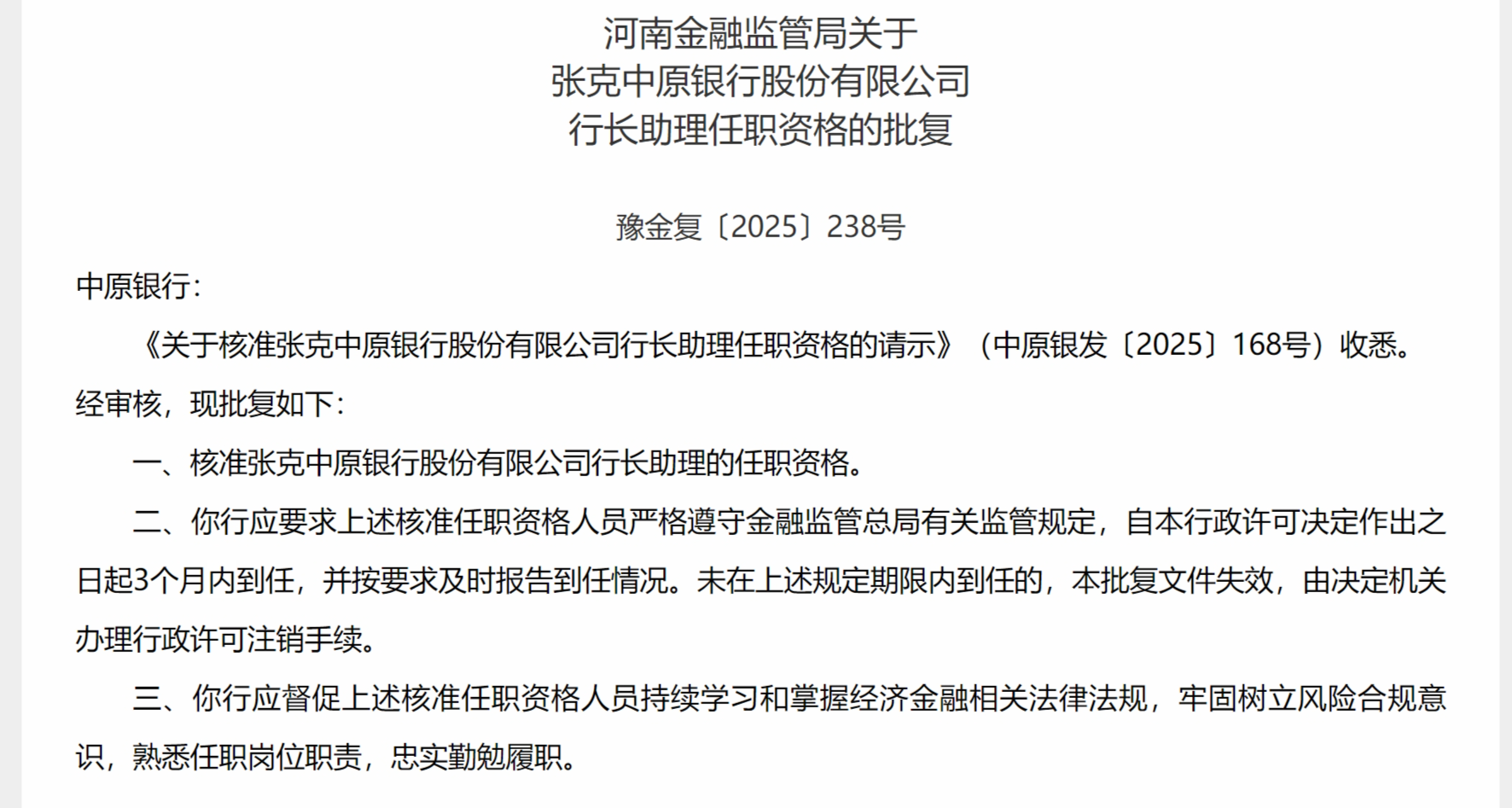 证券配资官网核准张克中原银行股份有限公司行长助理的任职资格 证券配资官网 来源:网上炒股加杠杆 网站:配资论坛门户,炒股开户流程,全国配资最好的公司 日期:2025-10-17 06:28:16 查看:198