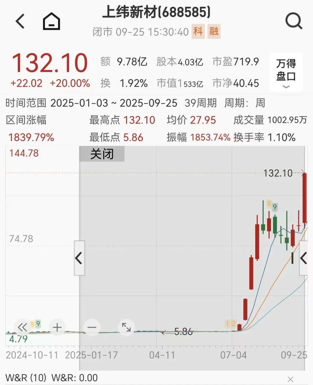 这也就意味着,智元机器人的要约收购中还有约3.37%的股份尚未明确来源,合计约1358万股。但截至9月25日,上纬新材再度涨停,股价已经狂飙至132.10元/股,中小投资者不可能再以7.78元/股的价格“贱卖”。