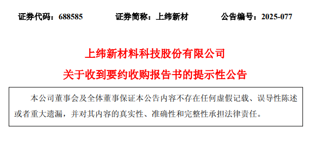 9月24日晚间,上纬新材(688585.SH)公布了《要约收购报告书》,智元机器人及核心管理团队共同出资设立的持股平台上海智元恒岳科技合伙企业(有限合伙)(简称“智元恒岳”),拟以7.78元/股的要约价格要约收购上纬新材1.49亿股股票(占上市公司总股本的37.00%)。