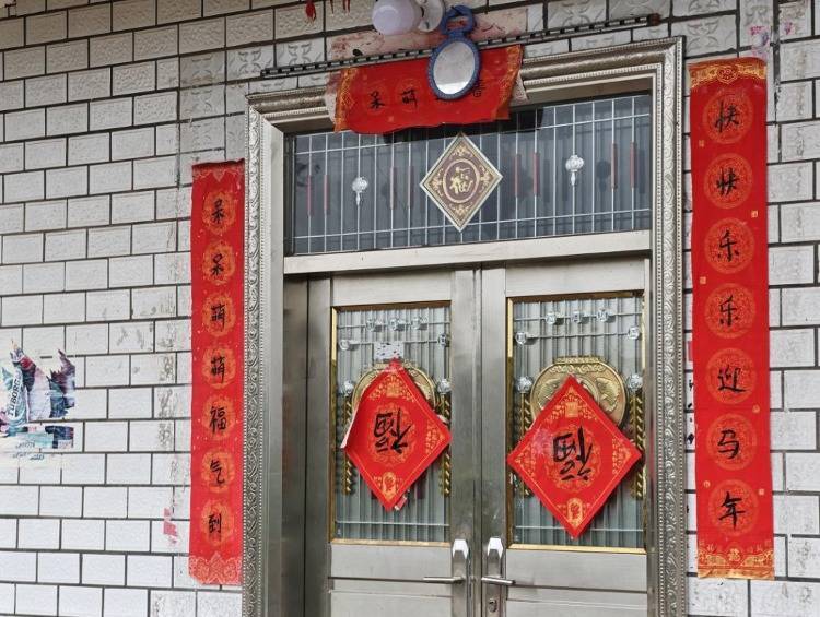 呆呆家的正门两侧张贴着一副对联,上联“呆呆萌萌福气到”,下联“快快乐乐迎马年” ,横批“呆萌迎春”。