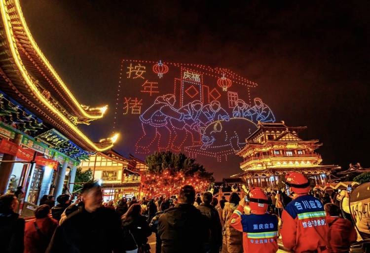 除夕夜,合川无人机光影秀吸引大量游客、市民观看。 “合川发布”微信公众号 图