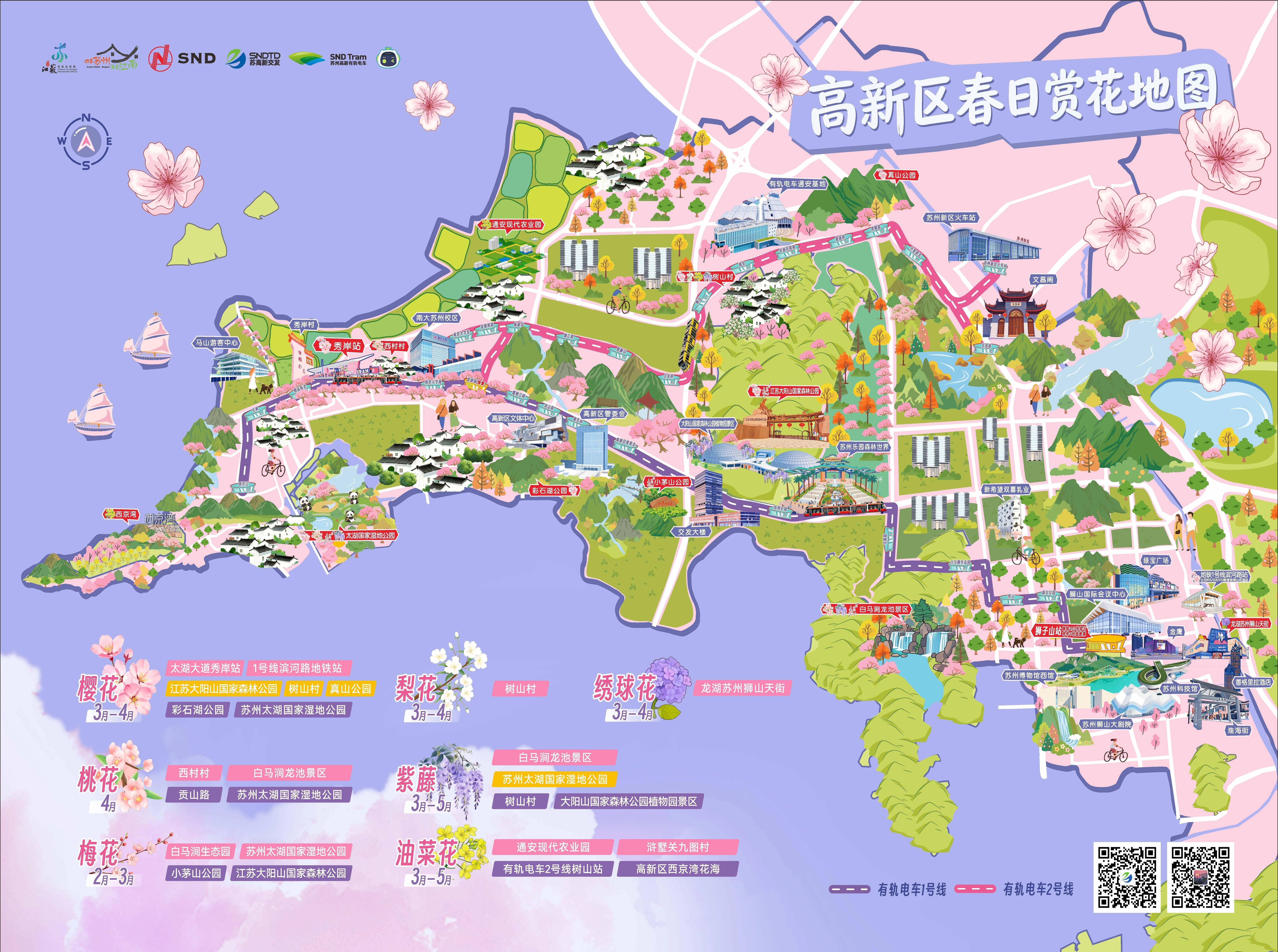 发布会现场,2026年高新区春日赏花地图重磅亮相。这张“追花指南”以有轨电车1号线和2号线为线,将全城的赏花胜地串珠成链——向东是繁华的狮山商圈,向西直抵太湖之滨,沿途不仅有秀岸樱花大道的“粉雪”纷飞,更串联起苏州乐园、大阳山、白马涧等热门地标。一张地图在手,真正实现“一路生花,步步皆景”。