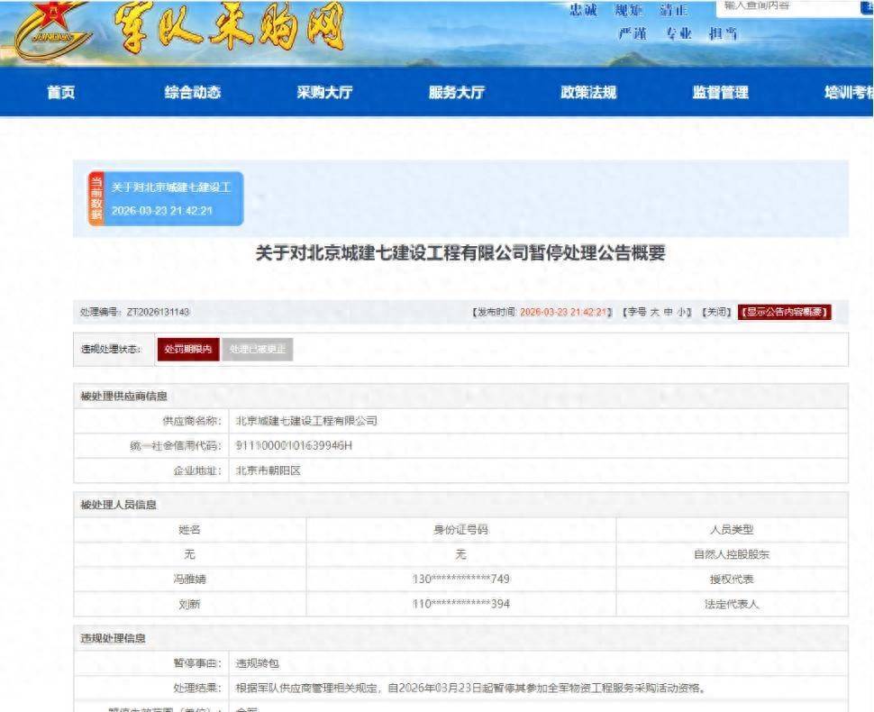 陆军采购管理部门公布的《关于对北京城建七建设工程有限公司暂停处理公告》显示,经调查,北京城建七建设工程有限公司在参加项目编号:2023-JL01-G1031采购活动中,涉嫌存在违规失信行为。根据军队供应商管理相关规定,自2026年03月23日起暂停其参加全军物资工程服务采购活动资格。在暂停期内,法定代表人刘新、自然人控股股东无控股或管理的其他企业暂停参加上述范围军队采购活动,授权代表冯雅婧暂停代理其他供应商参加上述范围军队采购活动。